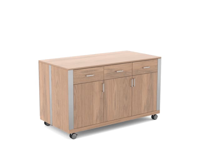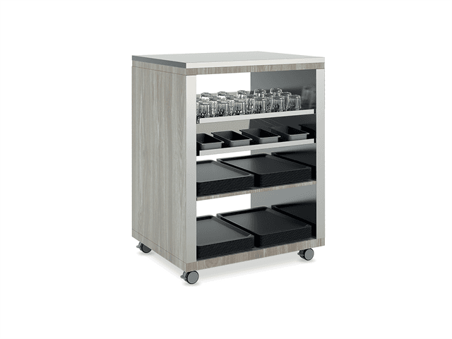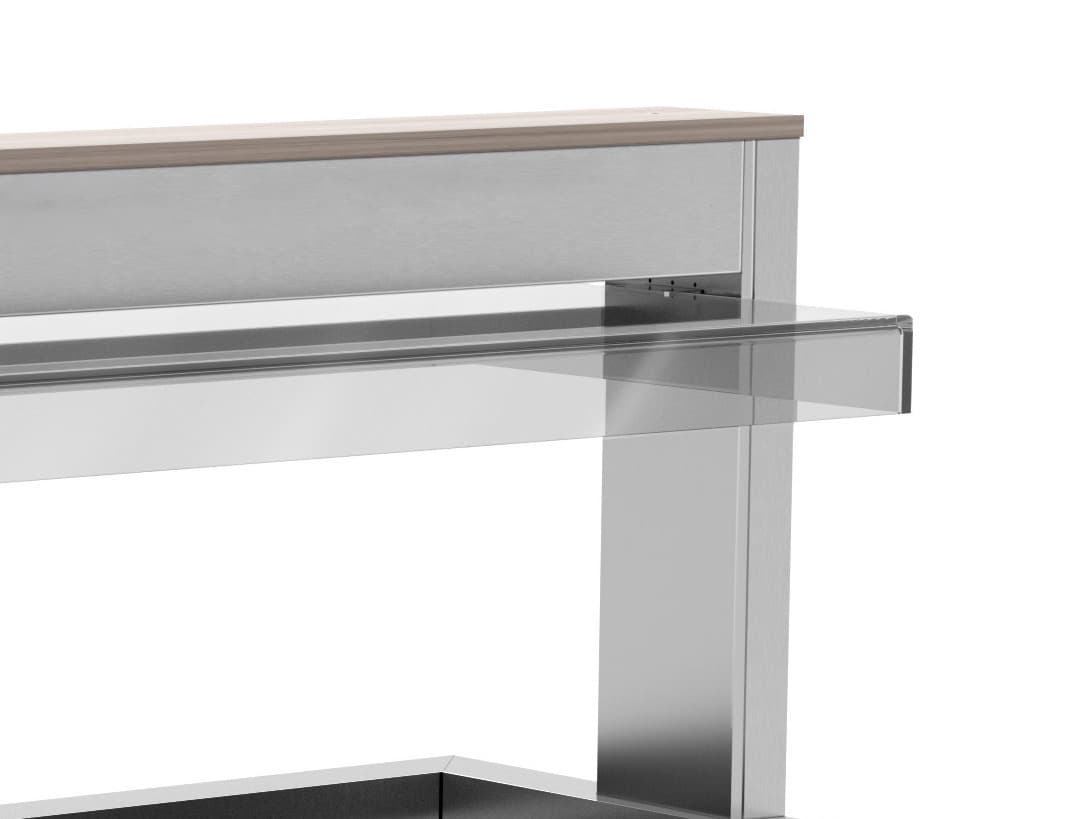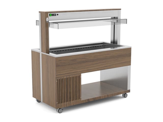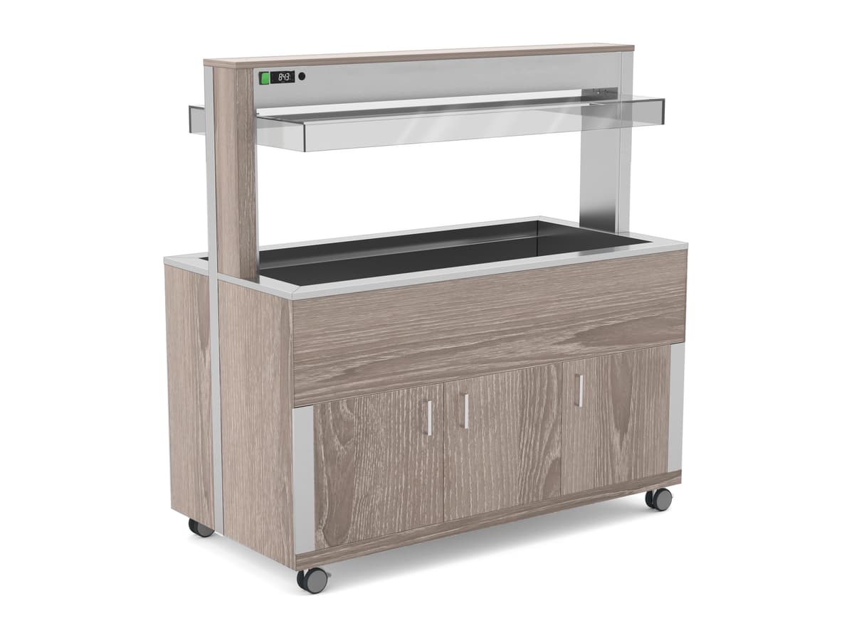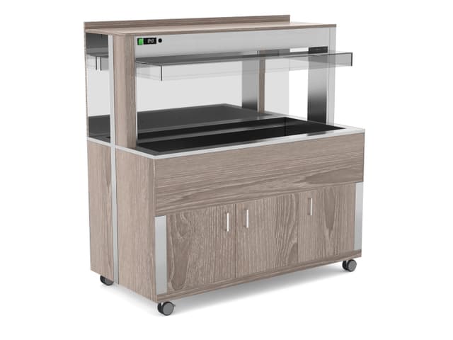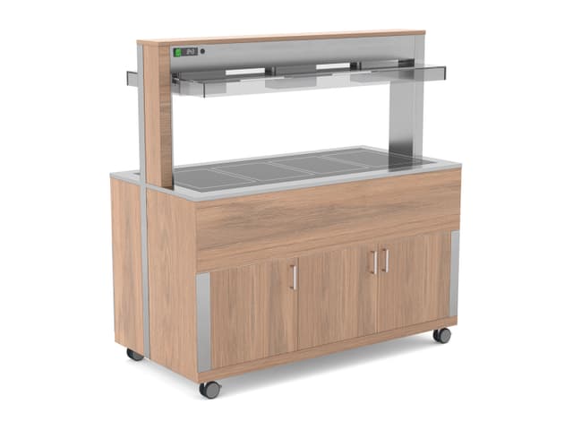 Modern self-service buffet line made entirely of water-repellent laminated wood with elegant stainless steel details. The modules of the ATHENA range can be used to furnish self-service lines characterized by a great aesthetic impact and can be configured as desired thanks to the many options and the various customizations available. The ATHENA line with its discreet and clean design allows you to elegantly furnish self-service corners inside hotel restaurant rooms or create lines with a strong aesthetic impact, enhancing the products presented.