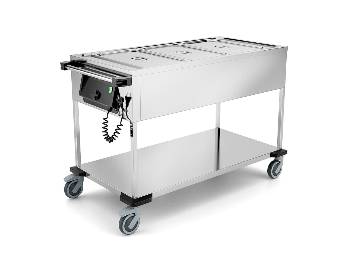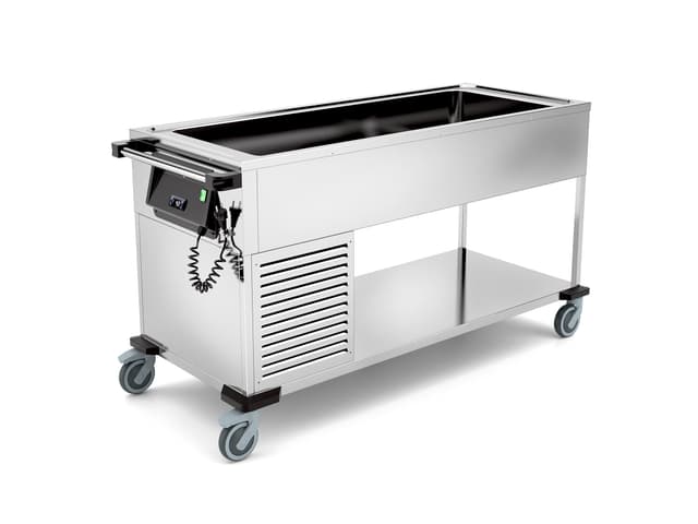 New generation of water bath and refrigerated trolleys in AISI 304 stainless steel with printed tanks and rounded edges for GN containers h.200mm (not included). Single temperature controlled tanks or separate controls (COMPASS SEP) with 2 or 3 GN1/1 capacity available depending on the model. Equipped with double wall insulation and drain tap. Ergonomic control panel facing the operator and removable for easy maintenance. Equipped with insulated push handle with plastic supports and convenient hook for the coiled cable when not in use. Models with front push handle (COMPASS FR) are available for insertion in self-service lines and models with backboards equipped with LED lighting (COMPASS LED) or halogen heating lamps (COMPASS HALO) Complete with a hygienic plexiglass tray and stainless steel tubular slide to create fast portioning zones. Each trolley has 4 anti-track corner bumpers and 2 wheels with brake as standard.