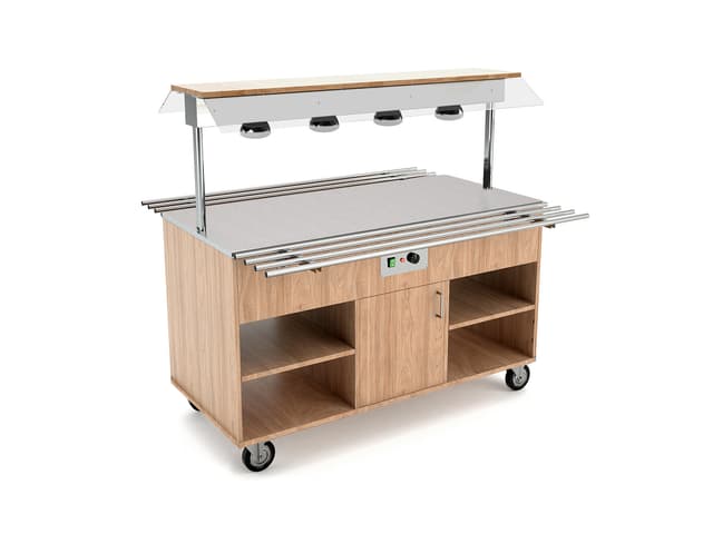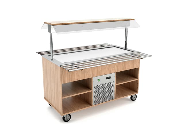 The HEKO models are entirely made of water-repellent laminated wood and are equipped with standard coverings with LED lighting and fixed parapet in plexiglass, sliding trays or supports front and rear folding plates and large wheels diam.125mm for easy and convenient handling. Numerous options are available such as lower compartment closure, upper protection rails or different types of slide trays in tube or stainless steel.