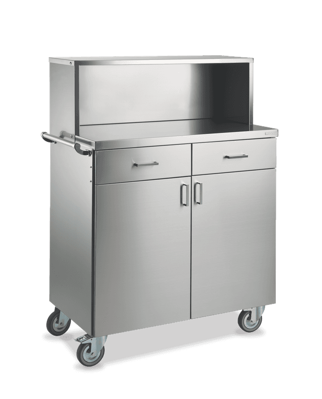To optimize the service outside and furnish with taste the summer terraces and verandas is available a line of service furniture built entirely in stainless steel AISI 304. Various models are available with different heights and the possibility of having doors or open compartments. All models are equipped with large wheels with 125mm diameter, 2 of which with brake and a comfortable push handle. For an optimal management of the cutlery you can choose the version with 2 drawers or with the practical cutlery holder with 6 compartments (Opt. PP/F) closed by a hygienic door. For the management of glasses it is possible to provide a practical rack (Opt.RA). Rocam’s attention to detail is not neglected even for these articles, all equipped with hinges that slow down the doors, to avoid annoying noises.