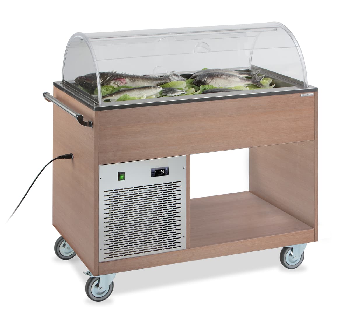 The range of service trolleys is completed with these refrigerated display trolleys for displaying fish or desserts. The preset temperature is automatically maintained inside the tank and the double opening plexiglass cloche guarantees a perfect view of the contents of the trolley from each side you observe it. Both models have a comfortable push handle and large wheels diam.125 mm for perfect maneuverability. Equipped with a drain tap to empty the tank from any melted ice used for the presentation of fish or other food. The GIUNONE model is also available in a refrigerated, ventilated version or heated to a bath water with external resistors placed under the tub.