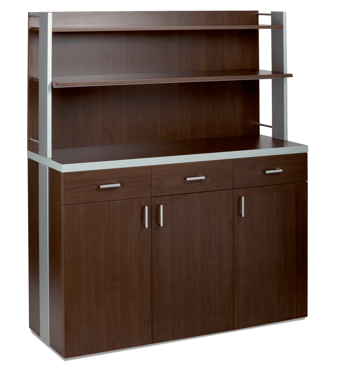Modern dumbwaiters on castors made of laminated wood for the restaurant hall with aluminium-look details. Models with 2 or 3 soft closing doors with inner shelf, upper middle shelf can be height adjusted. Instead of drawers, dumbwaiters can be equipped with an open 6 compartments cutlery holder (opt. PP/F). They can be provided with a reinforced base with bigger castors (Ø125mm) and handle (B/R) and extractable hopper mounted on rails (opt. TR).