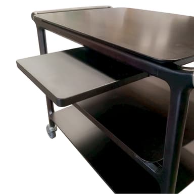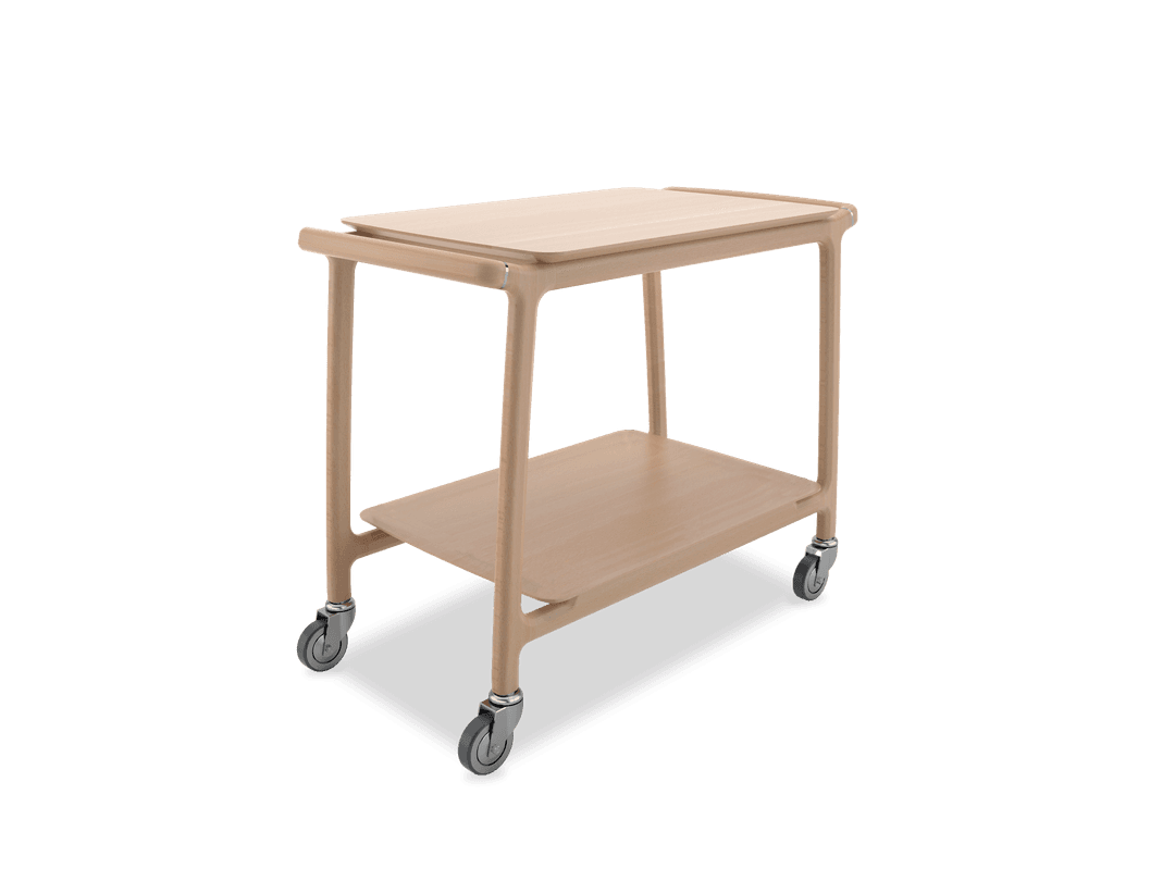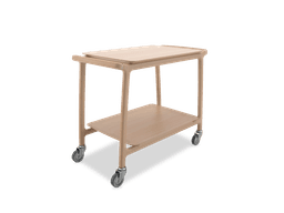 Solid wood service 2 tiers trolley with a new and innovative line. The design look is enhanced by small and refi ned details like the unique shape of the shelves and tiny elegant metal parts on the pushing handles. Equipped with 4 swiveling castors. Exact shelves dimension: 810x570 mm.