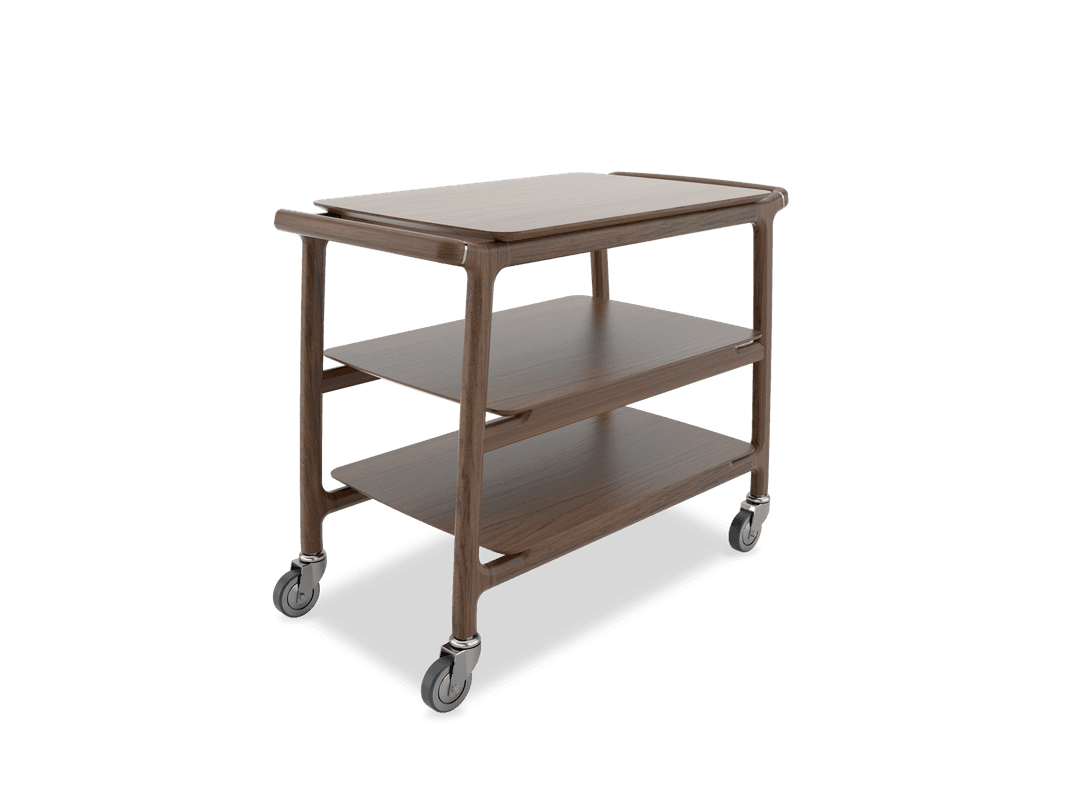 Solid wood service 3 tiers trolley with a new and innovative line. The design look is enhanced by small and refined details like the unique shape of the shelves and tiny elegant metal parts on the pushing handles. Equipped with 4 swiveling castors. Exact shelves dimension: 810x570 mm.