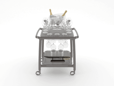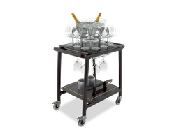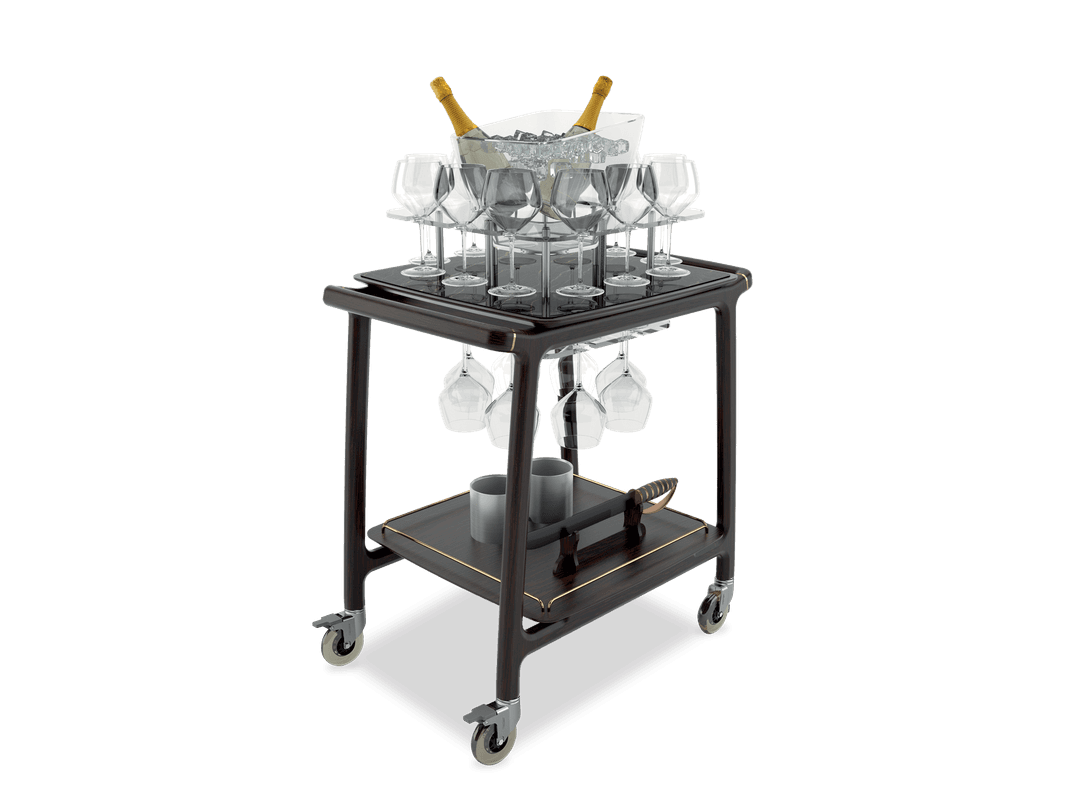 Champagne and sparkling wines trolley with an impressive presence in solid wood. Countertop covered by a marble-like laminate and equipped by plexiglass glasses racks. Central glacette bucket, the two bottle glacette on the lower floor and the retaining bars are included. On request it is available a scenographic sabre with its support for the practice of “sabrage” (Opt. SW). Two wheels with standard brake included.