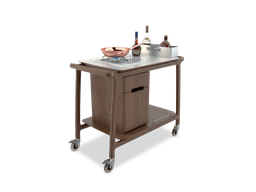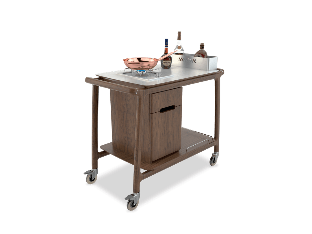 Flambè trolley equipped with single burner. Upper tier covered by a stainless steel coating. Equipped with one drawer and an integrated bottle holder on the countertop. Two castors with brake included. Gas bottle not included.