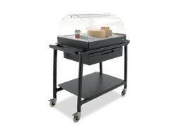 Two tiers solid wood trolley with detachable refrigerated display case. Hemispherical dome with double side opening. Refrigeration by means of chilling packs for up to 5 hours of cold service.