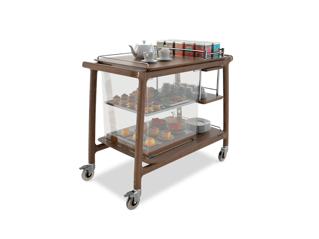Trolley for the service of tea and desserts in solid wood. The countertop is equipped by containing bars. The lower part is divided between a plexyglass showcase with a neutral shelf and a refrigerated one through one eutectic plate and 2 side shelves, one of which is extractable, for the crockery management. Two castors with brake included.