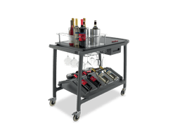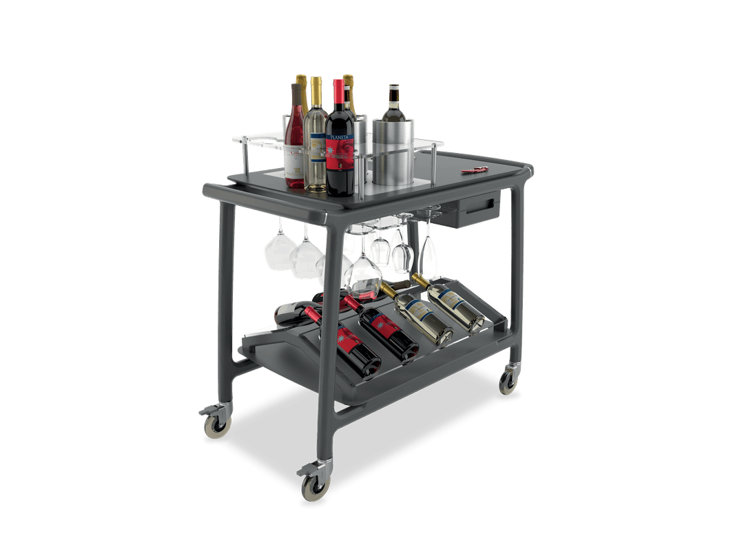 Solid wood trolley for wine bottles display with storage compartment, glass rack, cork collection pan and lower tier with dedicated structure for bottles display. Equipped with 4 bottle coolers placed on a chilling pack ensuring up to 5 hours of cool temperature. A useful digital thermometer allows a quick check of the temperature of the bottom of the coolers. Two castors with brake included.