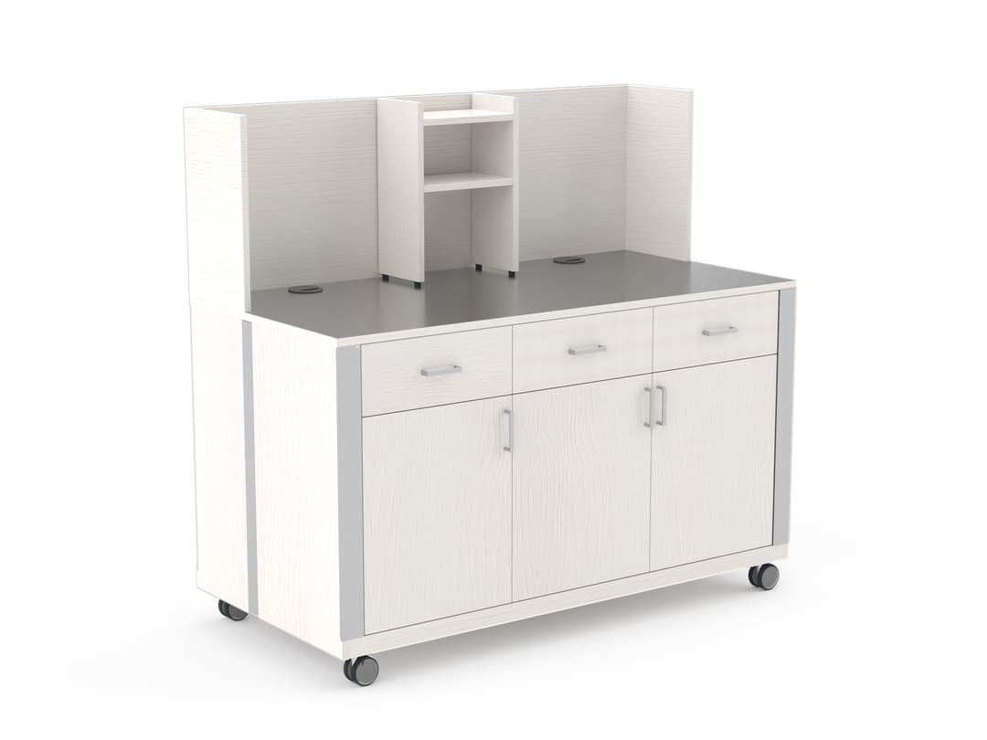 Specific workstation for coffee machines and beverage dispensers. Laminated wood structure and stainless steel worktop. The countertop has 2 holes with cable gasket for the cable management and water drainage. 3 Practical drawers and doors with anti-noise soft-closing mechanism. The rear wall allows to hide the non-aesthetic technical parts of the distributors.