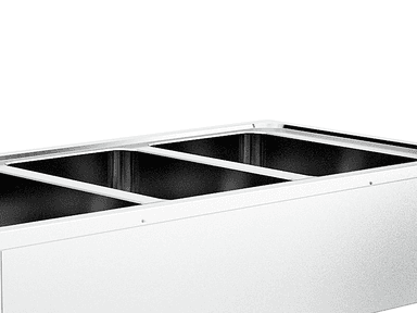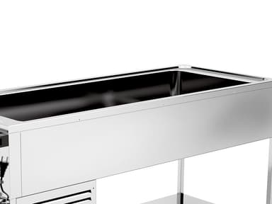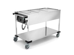 AISI 304 stainless steel bain-marie trolley with moulded well with rounded edges for GN containers h.200mm (not included). Equipped with double-wall insulation and drain cock. Ergonomic control panel facing the operator which can be removed for an easy maintenance. The trolley mounts an insulated push handle with plastic supports and a smart hook for the spiral cable when not in use. Each appliance has 4 anti-track corner bumpers and 2 castors with brake included.