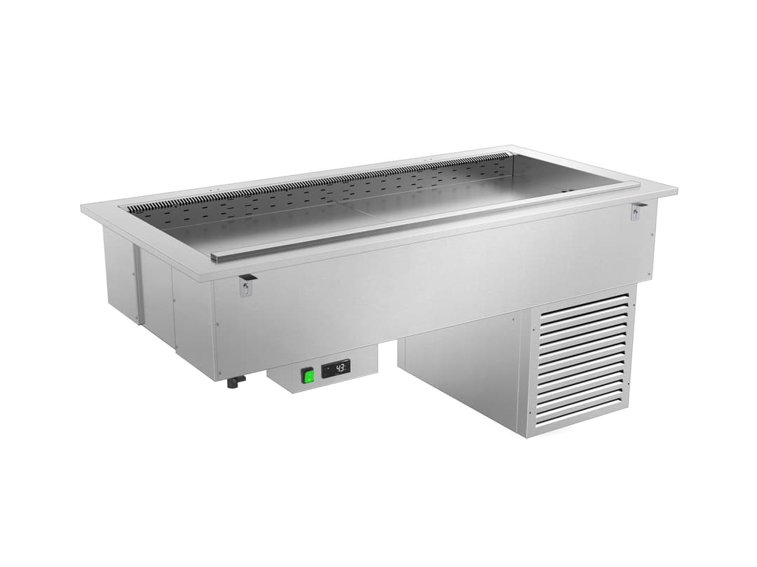 Blown-air refrigerated Drop-in with evaporator. The well is equipped by vents that create an air blade that improves cooling efficiency and optimizes consumption. Bottom panels adjustable in height to allow the insertion of GN pans (not included) max 100mm high. The bottom panels are fully removable to simplify cleaning and maintenance.