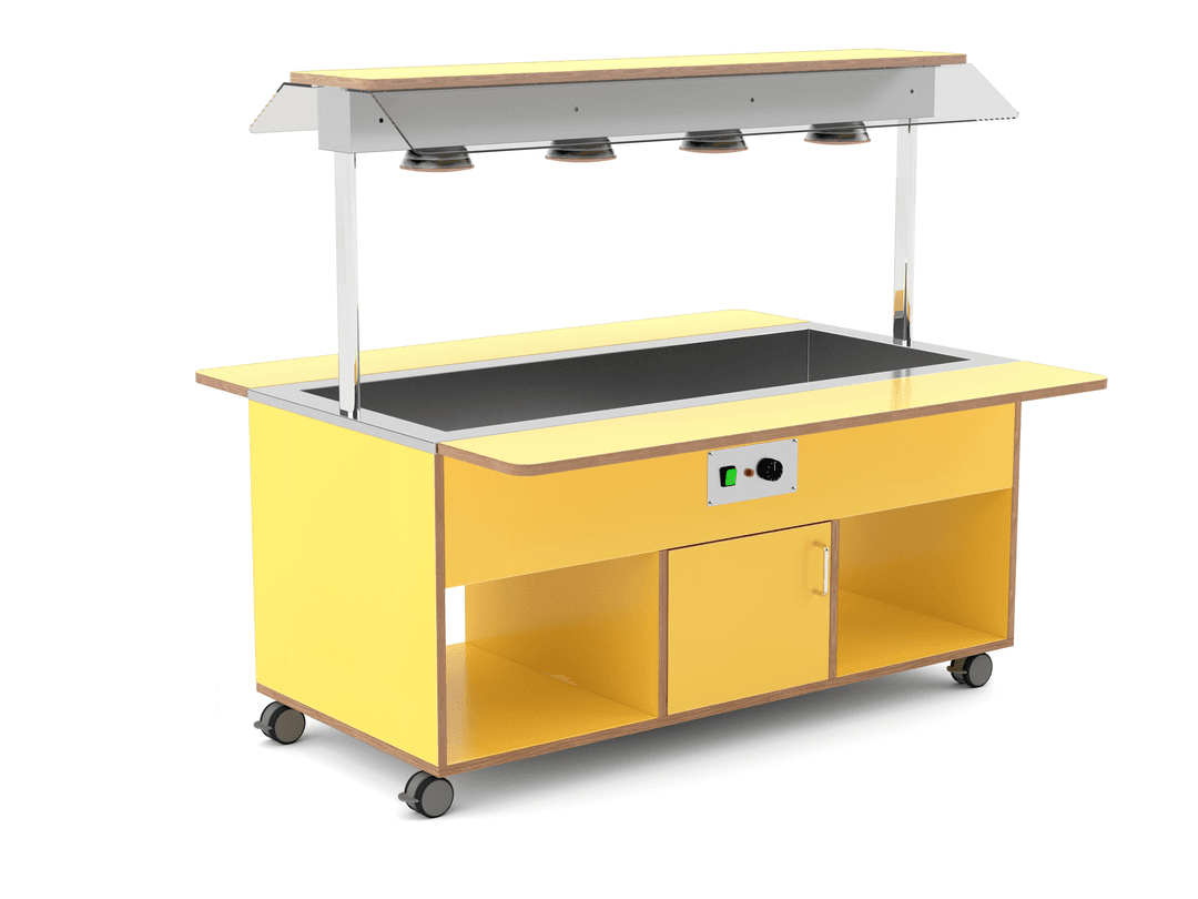 Bainmarie heated buffet for schools and family hotels with LED or infrared upper lighting, structure in laminated wood, available in the colors of our range with contrasting edges. Equipped by fix Plexyglass® sneezeguard and two front/back folding plate-holders as standard. 2 Heights for the worktop: 70cm or 50 cm to make their usage easy for the yougest. Sneezeguards and dish-holders have rounded angles for greater safety. Well 18 cm. deep with drain cock, size 3-4-5-6 GN 1/1.