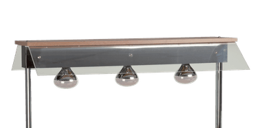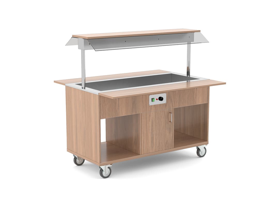 Heated buffet with laminated wood structure and chromed details. Capacity 3-4-5-6 GN 1/1. Fix Plexyglas® sneezeguard and front and back wood dishholders included. Stainless steel well, 18 cm. deep, equipped with drain cock. Bain marie heating with heating elements placed underneath the well, temperature controlled by mechanical thermostat (+30°/+90°C) with indicator light. Upper LED lighting or dry heating by means of infrared lamps, with indipendent switch on (BM/INFRA). Castors Ø125 mm, 2with brake included. Buffet equipped by an industrial plug.