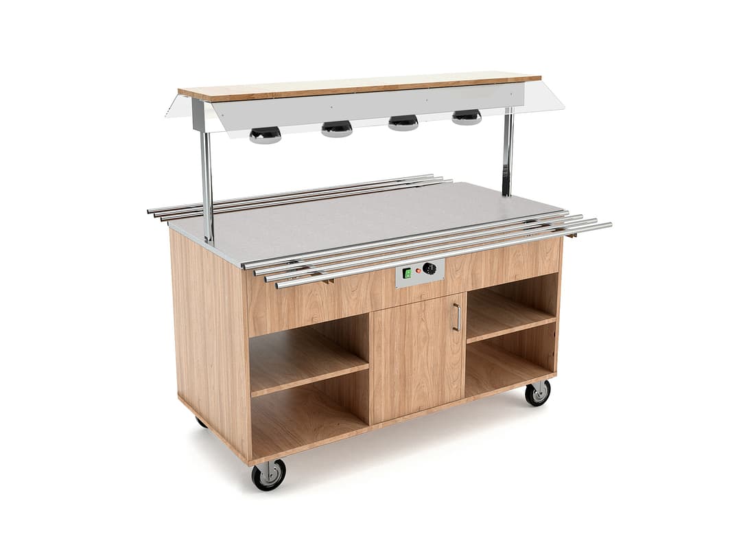 Heated buffets with laminated wood frame and stainless steel details, capacity 3-4-5-6 GN1/1. Fixed Plexyglass® top shell and double-sided folding wooden plate holders as standard. Smooth AISI 304 stainless steel top heated by resistors placed under the top itself. Infrared lamps placed on the included lift offer an additional heating source. Ø125 mm wheels, 2 of which with brake included.