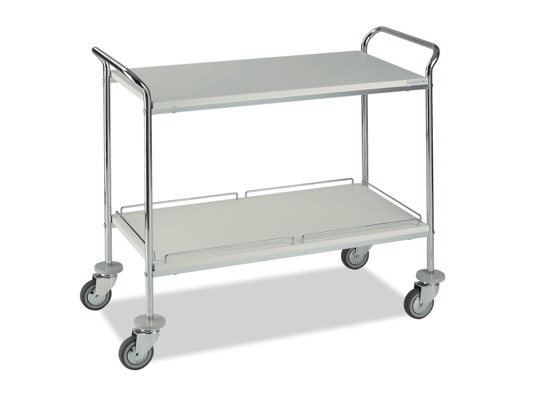 2 Tiers service trolley with structure in chromed round tube and laminated wood shelves with a wide choice of decors. 4 Non-marking bumpers and swiveling castors Ø100 mm included. Chromed or black nickel round tube structure.
