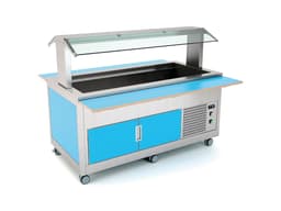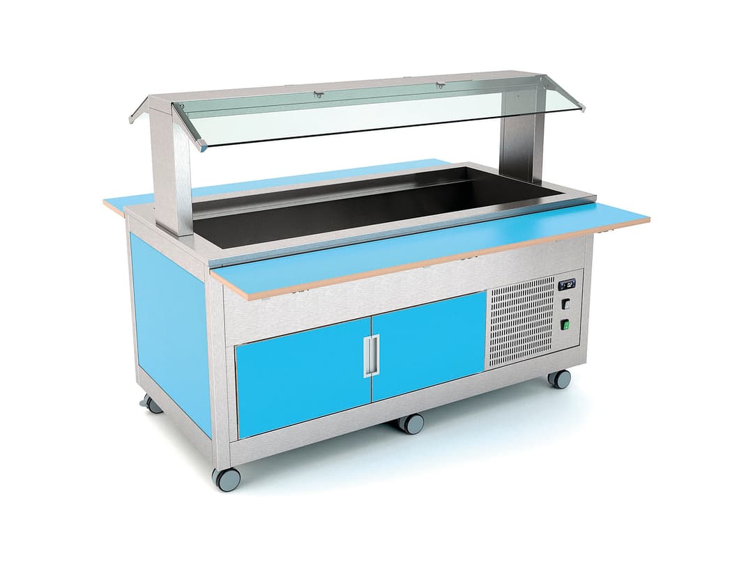 Buffet with static or ventilated refrigeration for primary schools and in family hotels.Refrigeration by means of a compressor unit with R290 gas. Height adjustable feet. It is equipped with a 26cm deep stainless steel well with rounded edges with a drain cock. The well temperature is regulated by digital thermostat.
