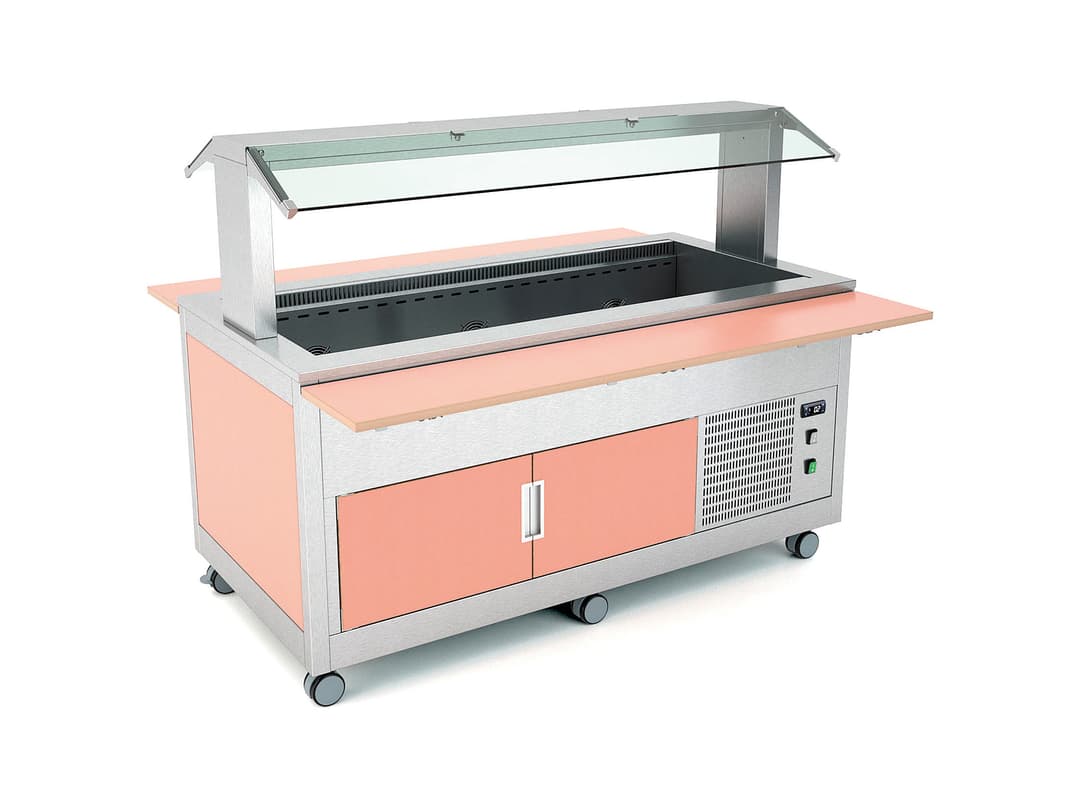 Buffet with ventilated refrigeration for primary schools and in family hotels.Refrigeration by means of a compressor unit with R290 gas. Height adjustable feet. It is equipped with a 26cm deep stainless steel well with rounded edges with a drain cock. The well temperature is regulated by digital thermostat.