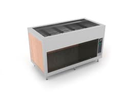 Buffet with static heating through high efficiency in air and armored dry heating element. The temperature is set by a digital thermostat. The well is equipped with side supports for pans, two dividers and by a drain tap to facilitate cleaning operations. Stainless steel structure available with standard wooden paneling or overcoating (SPP), stainless steel paneling (SST) or powder coated paneling (CST). Equipped by adjustable feet that can be masked by a skirting board. Maximum height 150 mm.