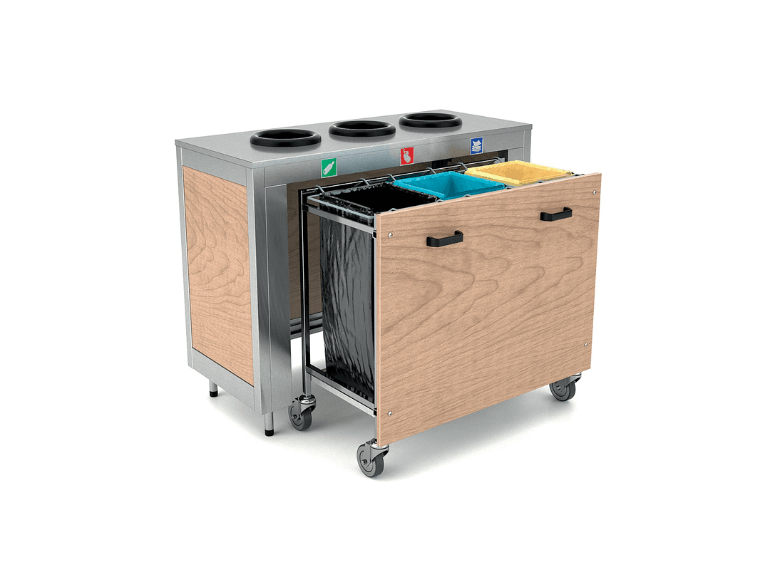 Trash sorting module with 3-4 holes. Stainless steel structure and panelling in standard laminated wood or with over-panelling (SPP). The panels are also available in stainless steel (SST) and painted steel (CST). The holes are protected by arubber gasket that can be completed by a lid (on request). Stickers to mark the different sorting are NOT included.
