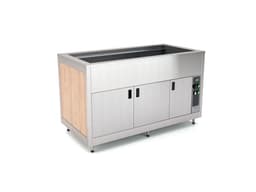 Bain-marie heated buffet, available with heated lower compartment. Equipped by adjustable feet that can be masked by a skirting board. It is equipped with a 26cm deep stainless steel well with rounded edges with a drain cock and heated by silicone adhesive elements. Well and lower compartment temperature are adjustable via digital thermostat.