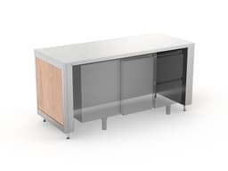 Roll-in counter with worktop that allows the insertion of small undercounter appliances. Stainless steel structure and panelling in standard laminated wood or with over-panelling (SPP). The panels are also available in stainless steel (SST) and painted steel (CST).