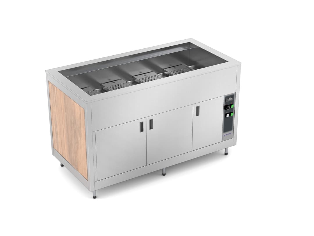 Buffet with static heating through high efficiency in air and armored dry heating element. Fan-assisted heated lower compartment. The temperature is set by a digital thermostat. The well is equipped with side supports for pans, two dividers and by a drain tap to facilitate cleaning operations. Stainless steel structure available with standard wooden paneling or overcoating (SPP), stainless steel paneling (SST) or powder coated paneling (CST). Equipped by adjustable feet that can be masked by a skirting board. Maximum height 150 mm.