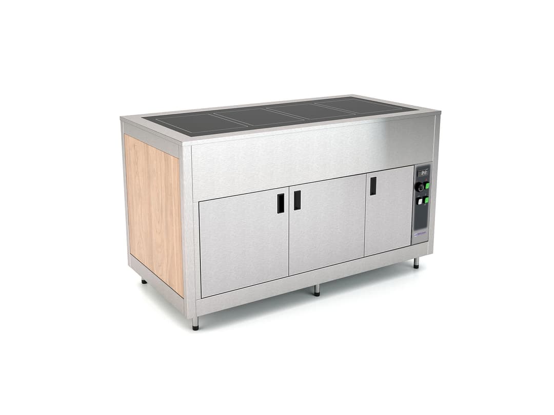 Buffet with tempered glass heated countertop (no induction) and fan-assisted heated lower compartment. Stainless steel structure available with standard wooden paneling or over-paneling (SPP), stainless steel paneling (SST) or powder coated paneling (CST). Equipped by adjustable feet that can be masked by a skirting board. Temperature set by digital thermostat. Heated areas on the worktop are clearly indicated by grooves. Each module can be configurated with different types of lighting, sneezeguard, tray holders among with many other optionals.