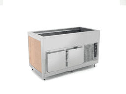 Static refrigerated buffet with refrigerated lower compartment. The well and the lower compartment are equipped with independent refrigeration thanks to 2 separate compressors and regulated by 2 electronic thermostats. The cooling units are powered by R290 gas. Stainless steel tank deep 26cm with rounded edges and drain tap. The buffet has a stainless steel structure and laminated wood panels as standard or with over-panelling (SPP). The panels are also available in stainless steel (SST) or painted metal sheet (CST). Equipped with adjustable feet in height that can be hidden by a skirting mask. The buffet can be completed with different types of lighting and many other options.