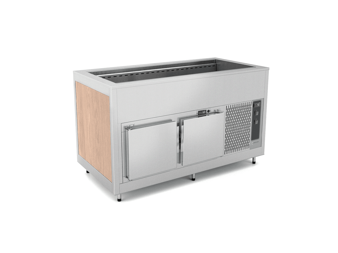 Buffet with fan-assisted refrigeration, stainless steel structure available with standard wooden paneling or overcoating (SPP), stainless steel paneling (SST) or powder coated paneling (CST). Equipped by adjustable feet that can be masked by a skirting board. Refrigeration by means of a compressor unit with R290 gas, with a pre-programmed defrost system. Height adjustable feet with skirting board. It is equipped with a 26cm deep stainless steel well with rounded edges with a drain cock. The well temperature is set by digital thermostat. Each module can be equipped by different types of lighting, sneezeguard, tray holders among with many other optionals.