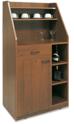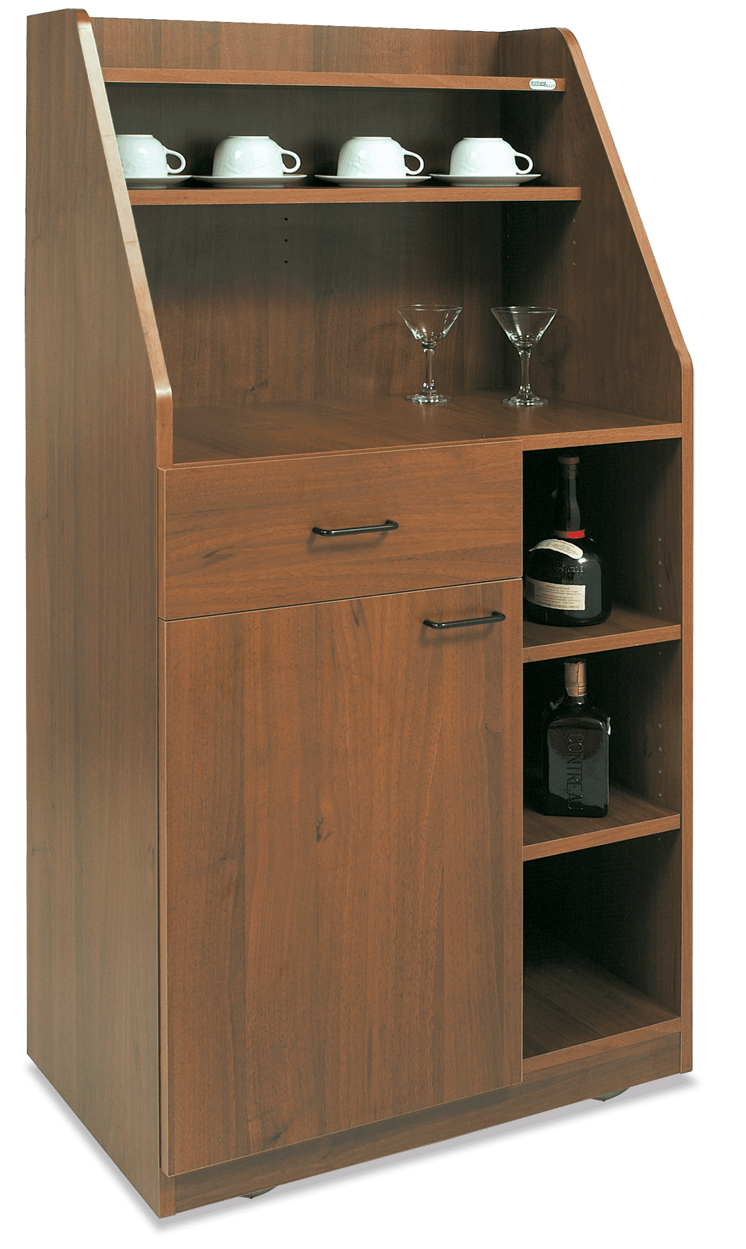 Waiter station on castors made of laminated wood for restaurant halls. Equipped with 2 drawers with inner dividers for cutlery, 2 soft closing doors with inner height-adjustable shelf and 2 upper shelves, one of which height-adjustable. Instead of the drawers an open 6-compartment cutlery holder is available (opt. PP/F). They can be provided with a reinforced base with bigger castors (Ø125mm) and handle (B/R).