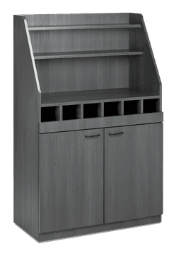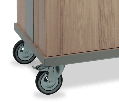 Waiter station on castors made of laminated wood for restaurant halls. Equipped with 2 drawers with inner dividers for cutlery, 2 soft closing doors with inner height-adjustable shelf and 2 upper shelves, one of which height-adjustable. Instead of the drawers an open 6-compartment cutlery holder is available (opt. PP/F). They can be provided with a reinforced base with bigger castors (Ø125mm) and handle (B/R).