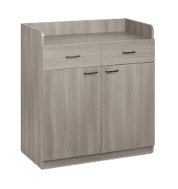 Service furniture on wheels made of laminated wood. Equipped with two drawers with internal dividers for cutlery, two doors with slow closing, with internal shelf adjustable in height and two upper shelves, one of which is adjustable in height. Instead of drawers, an open 6-compartment cutlery rack is available on request (PP/F option). The furniture can be equipped with a reinforced base with larger wheels (Ø125mm) and push handle (B/R).