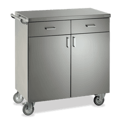 Waiter station on castors made of laminated wood for restaurant halls. Equipped with 2 drawers with inner dividers for cutlery, 2 soft closing doors with inner height-adjustable shelf and 2 upper shelves, one of which height-adjustable. Instead of the drawers an open 6-compartment cutlery holder is available (opt. PP/F). They can be provided with a reinforced base with bigger castors (Ø125mm) and handle (B/R).