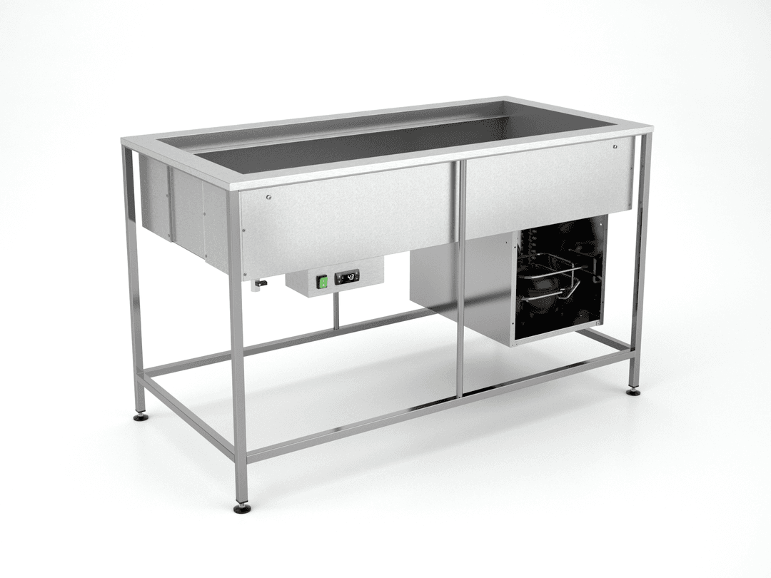 Stainless steel structure for the support of our drop-in modules, coverable by the customer. The central tube can be removed to allow the installation of plate holding niches. Adjustable feet as standard.