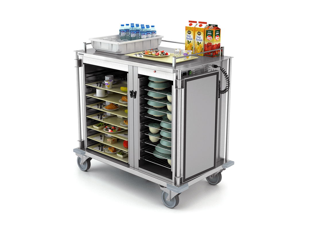 Thermic trolley for the distribution of meals in foodgrade AISI 304 stainless stee. Structure divided into 2 practical compartments: one neutral side for trays storage and an heated side in 10x1GN1/1 size for the maintaining of hot meals. The thermic break between the two parts is made of technical material that ensure the greater thermic efficency and a better insulation between the compartiments. The internal guides of both compartments are completely removable and washable and the smooth internal walls allow an easy and complete cleaning. The trolley is equipped with 4 solid ergonomic push handles in AISI 304 stainless steel tube, two doors with a 270°space-saving opening and insulating gasket. Temperature regulated by a digital thermostat with HACCP recording. 4Castors in high resistance steel, 2 with brake, 4 non-marking bumpers and a 5th amortized wheel as a standard.