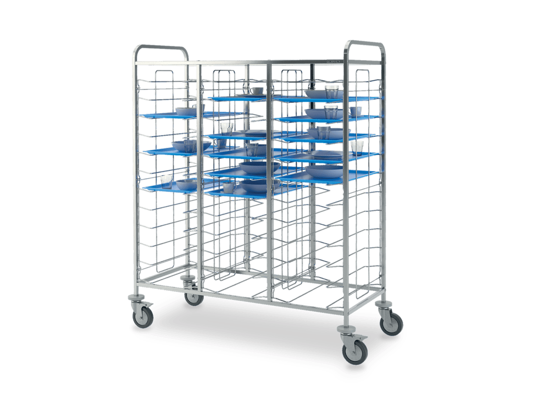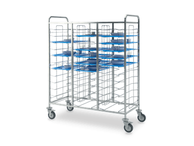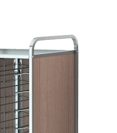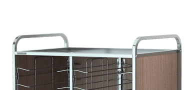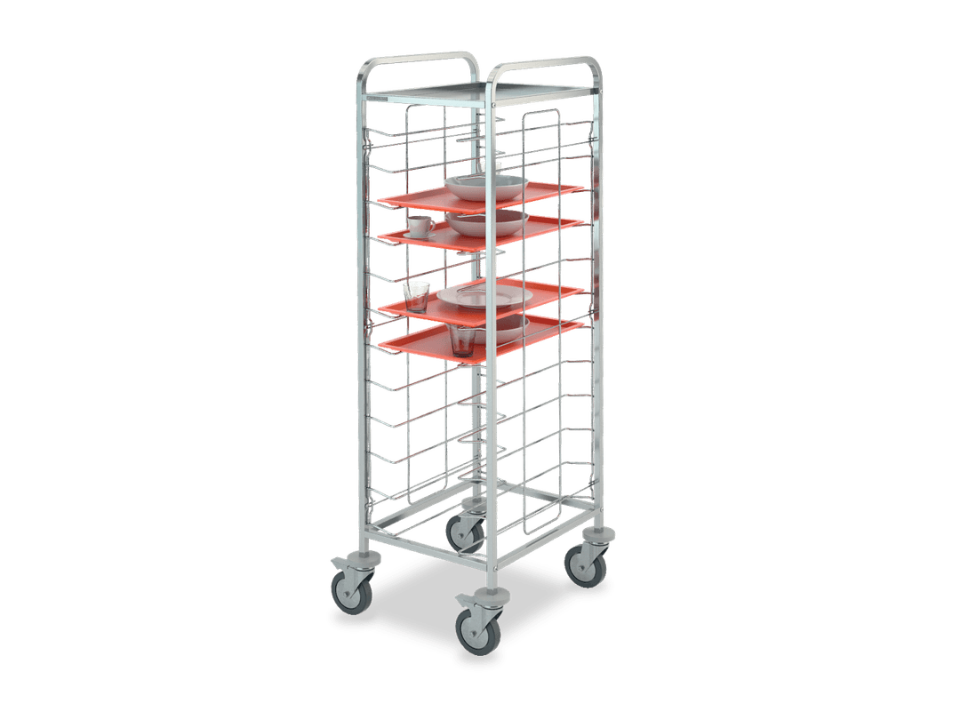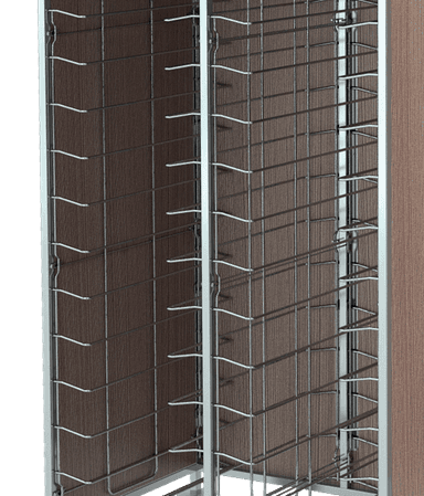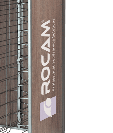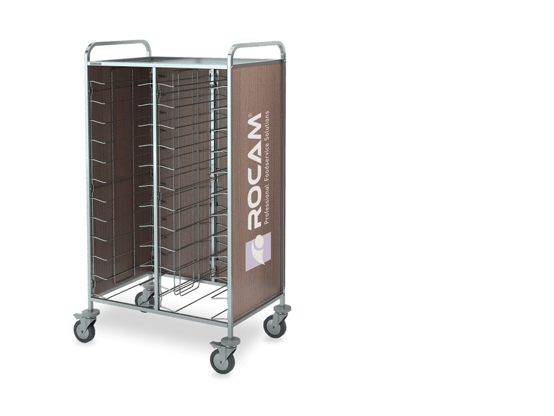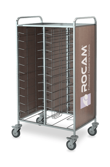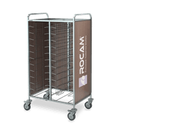 Rack trolleys with AISI 304 stainless steel structure for baking pans and trays storage. Chromed wire steel guides. All models are equipped with 4 non-marking bumpers and 4 swiveling castors, on request can be fitted with 2 castors with brake (opt. RF). Each model can be fitted by a side paneling in HPL (LAT) or by a side + back HPL paneling (HPL). Always on request can be mounted an upper stainless steel shelf (CAP).
