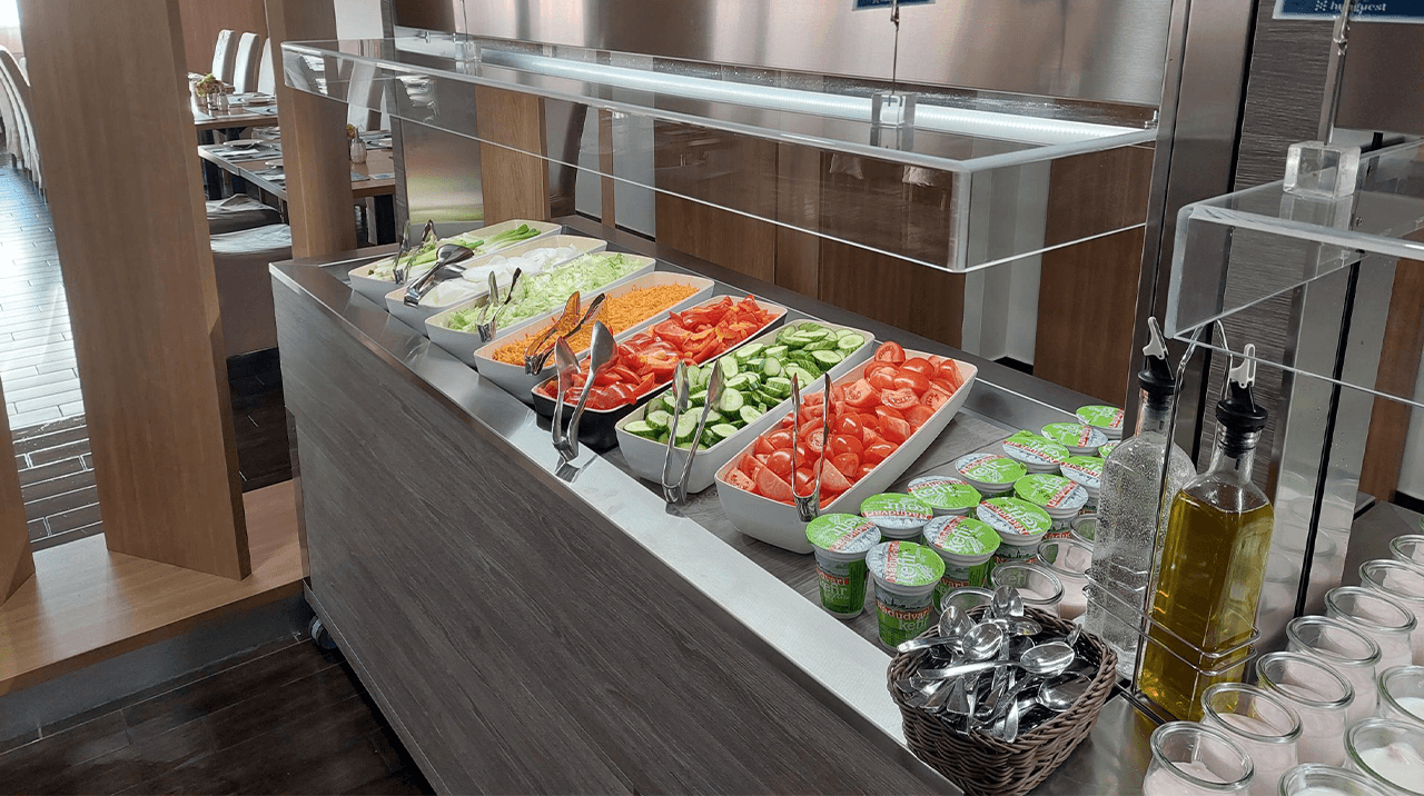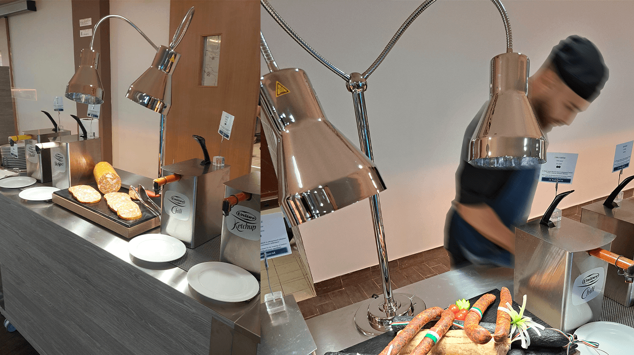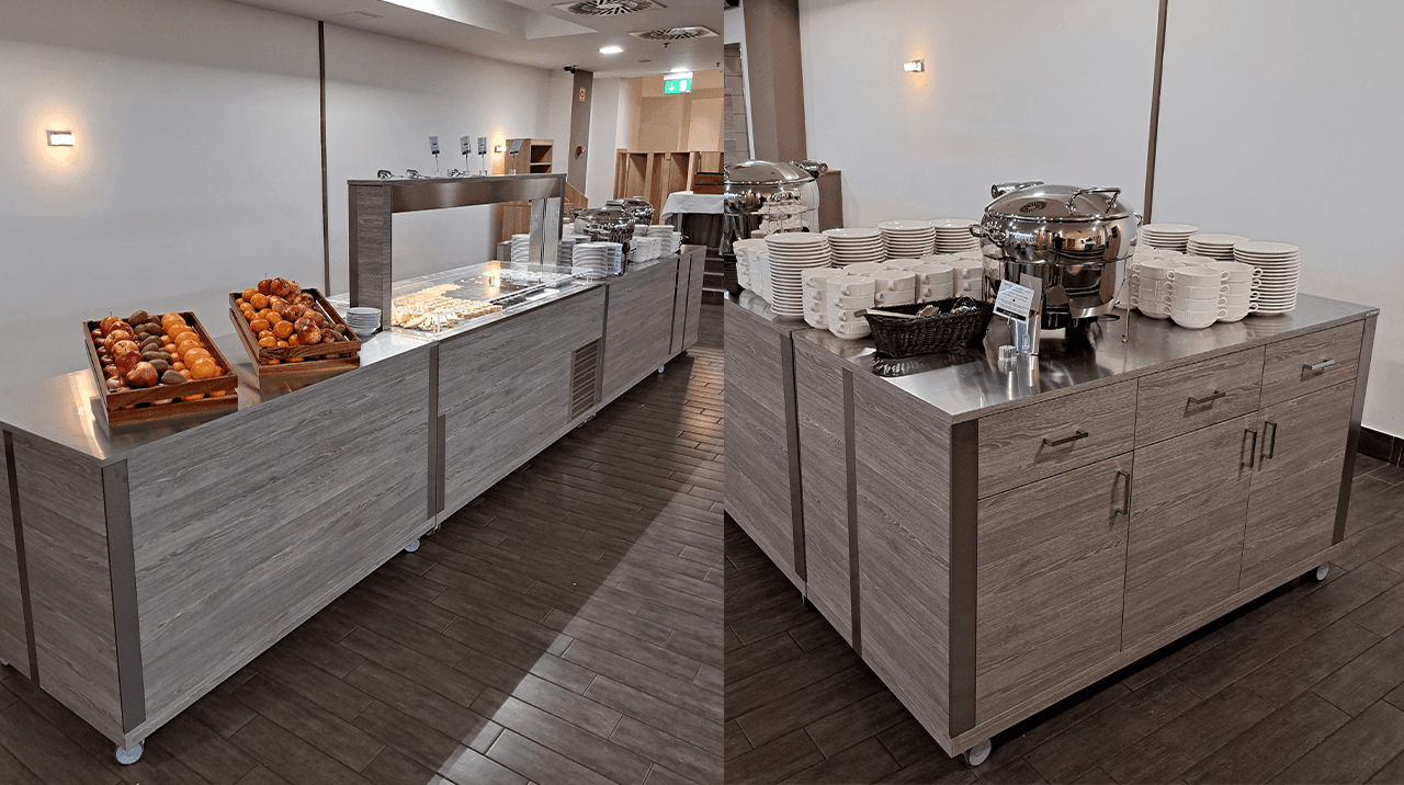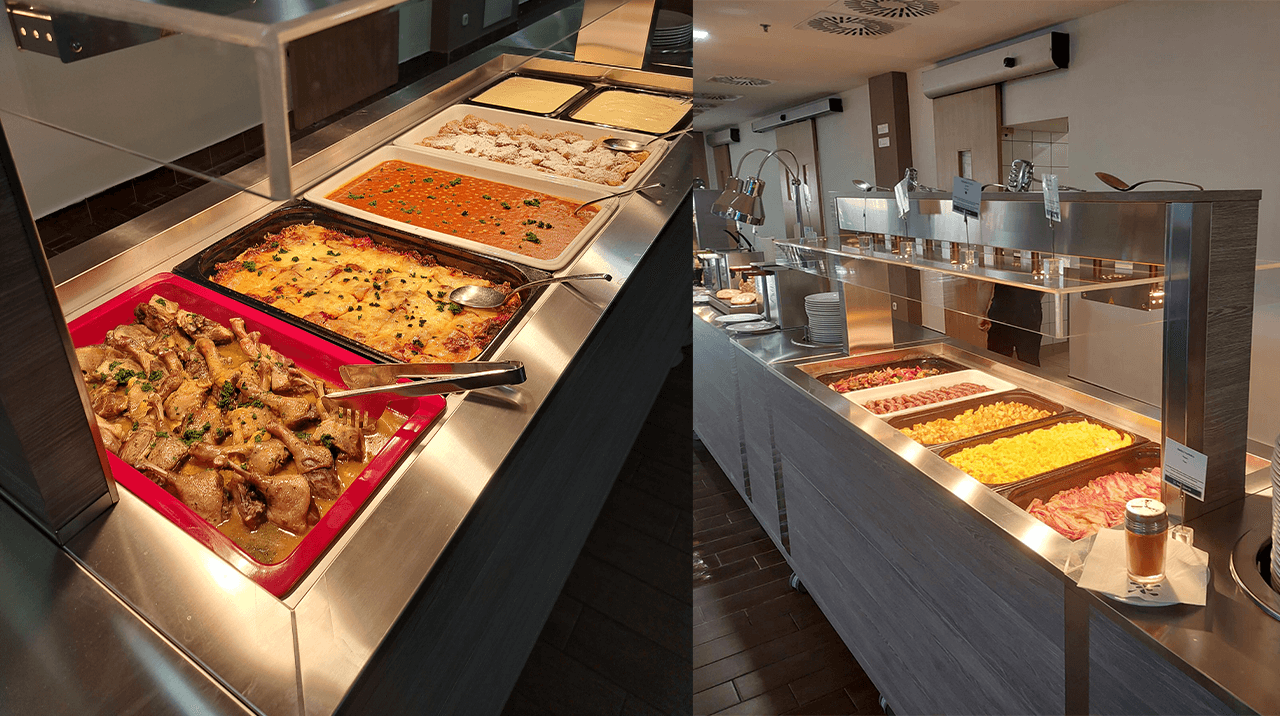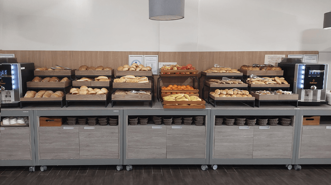 An entire breakfast room of a hotel in Hungary made by Rocam: from hot, cold and neutral ATHENA buffets, to BREAK modules, to HELIOS infrared lamps, there is everything you need to serve a multitude of meals and meet the needs of the client.