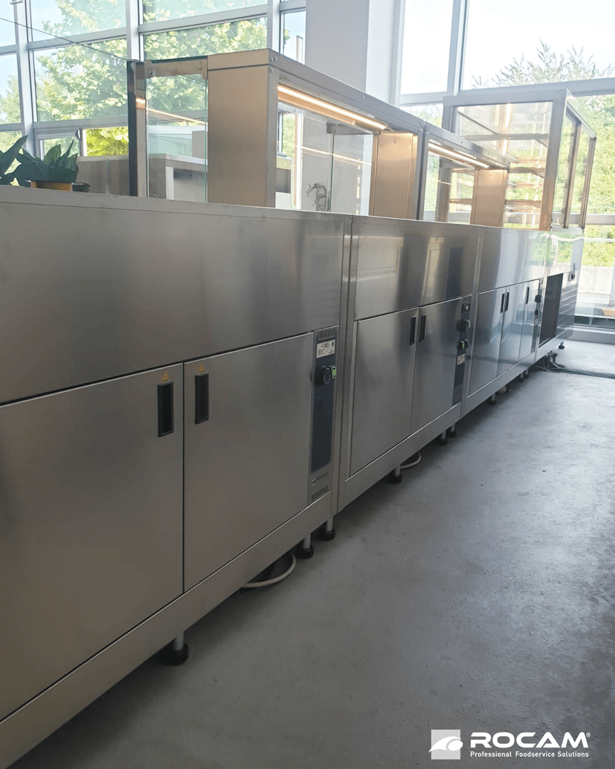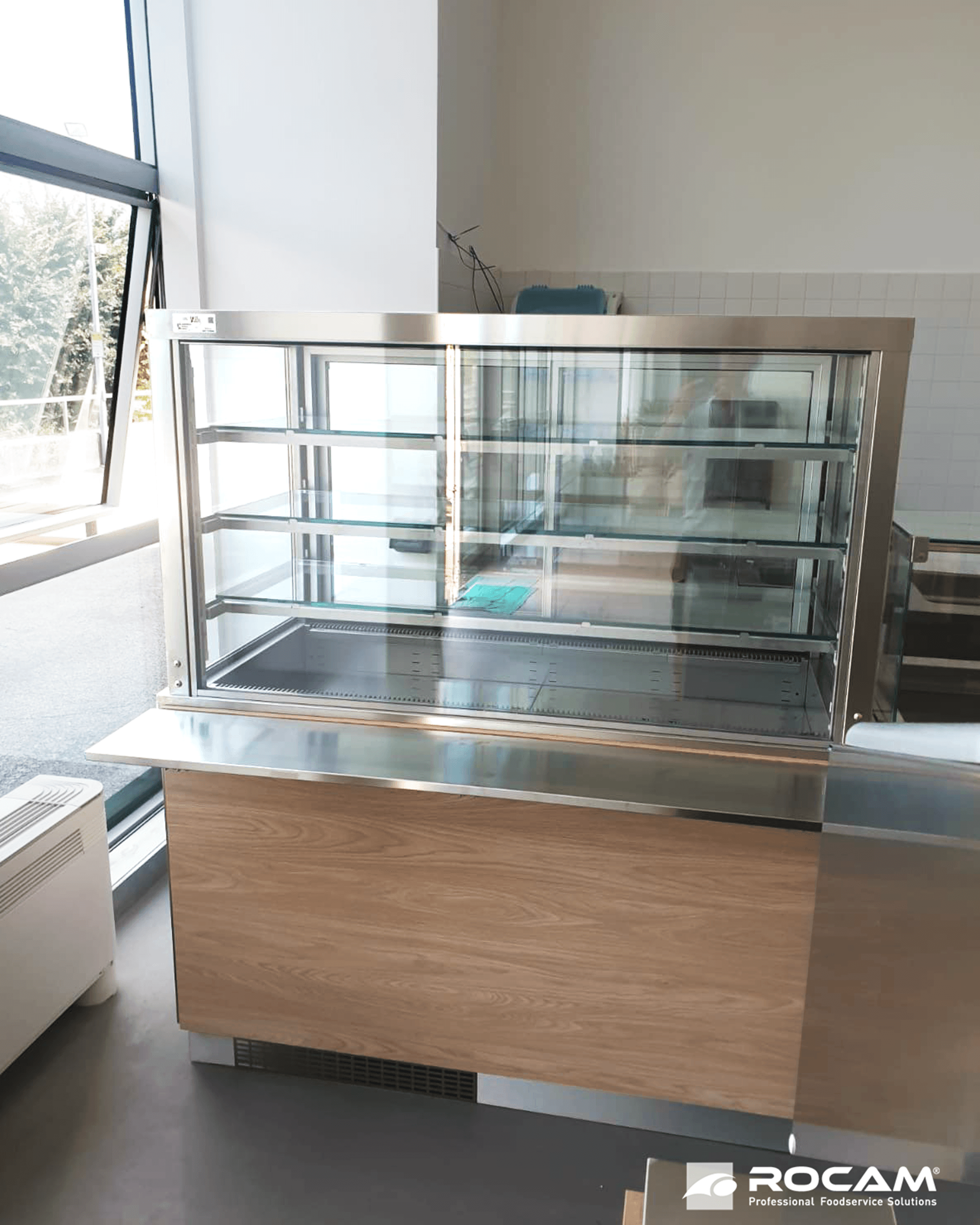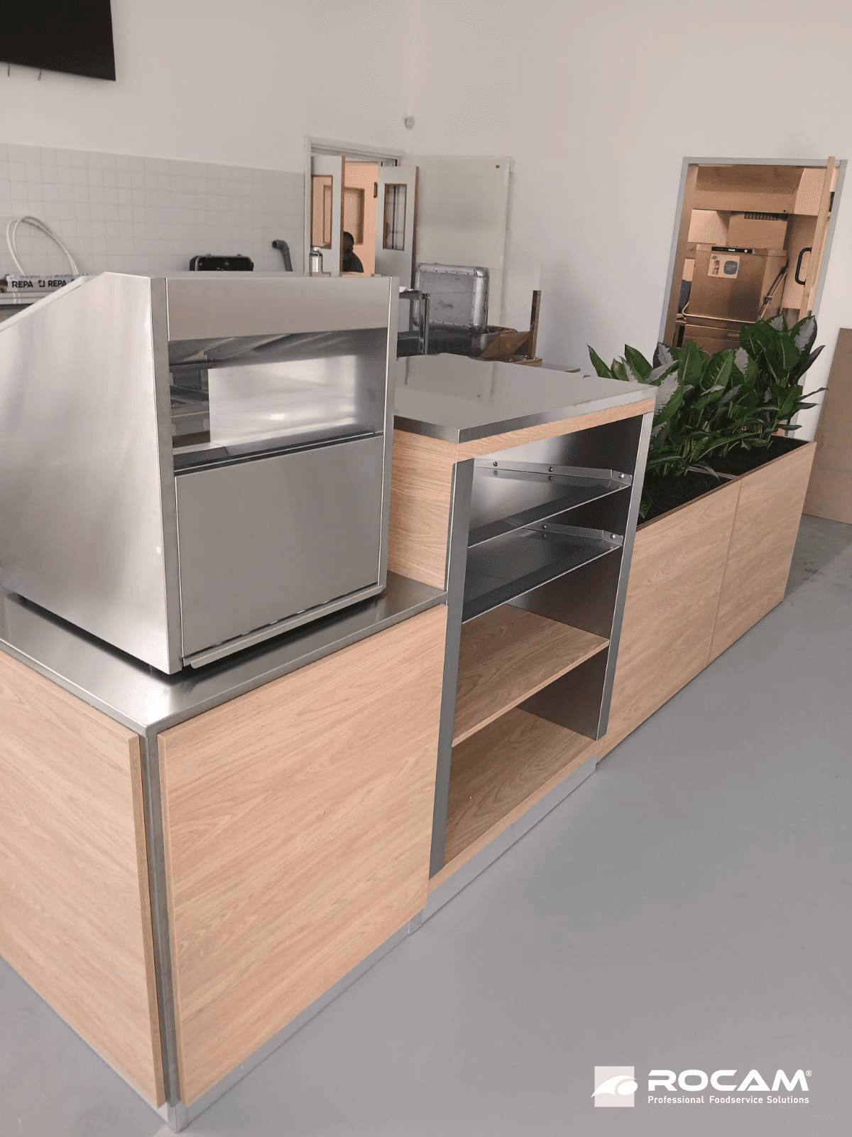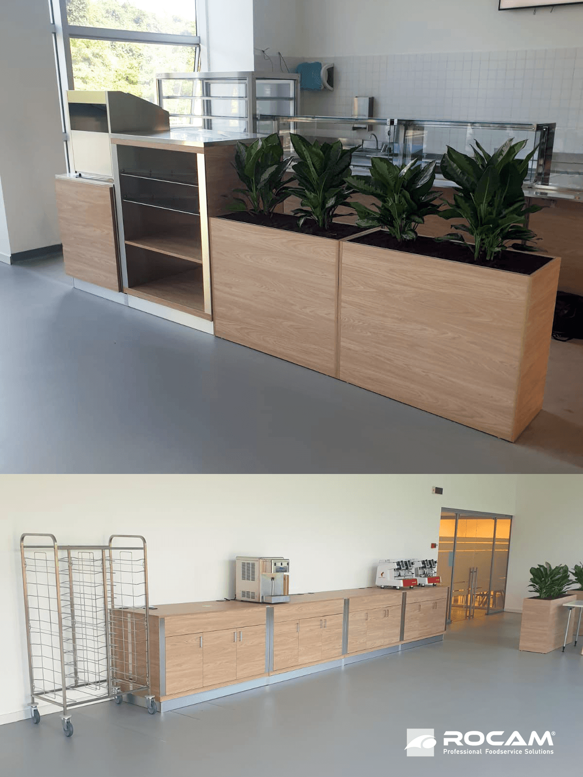 New company canteen completed in Veneto and our OMNIA line is at the center of it. The elm-colored over-panelling and the sliding stainless steel trays give everything the same elegance as a custom made line, without sacrificing the practicality of a modular line. The environment is completed by beautiful custom-made planters in laminated wood, with a stainless steel tank to accommodate the plants.